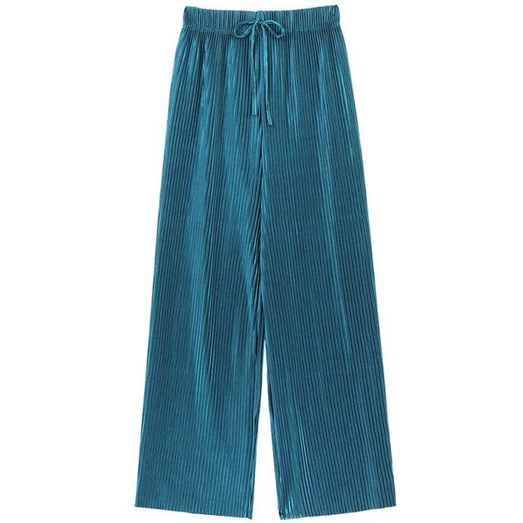 Women Fashion Summer Wide Leg Pants Pleated Ice Silk Trousers Elastic Waist Loose Casual Pants